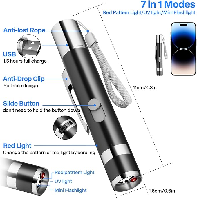 - 【Multi Function】This cat light toy is versatile and fun. It doubles as a bright pointer for presentations, offering clear visibility. The button works with a single push, so you don’t need to hold it down. It also has a glow-in-the-dark mode for added fun and a purple mode to detect counterfeit money. Perfect for both playtime and practical use!