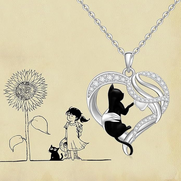 Black Cat Necklace for Women 925 Sterling Silver Cat Necklace Heart Cat Necklaces Pendant Halloween Christmas Gifts