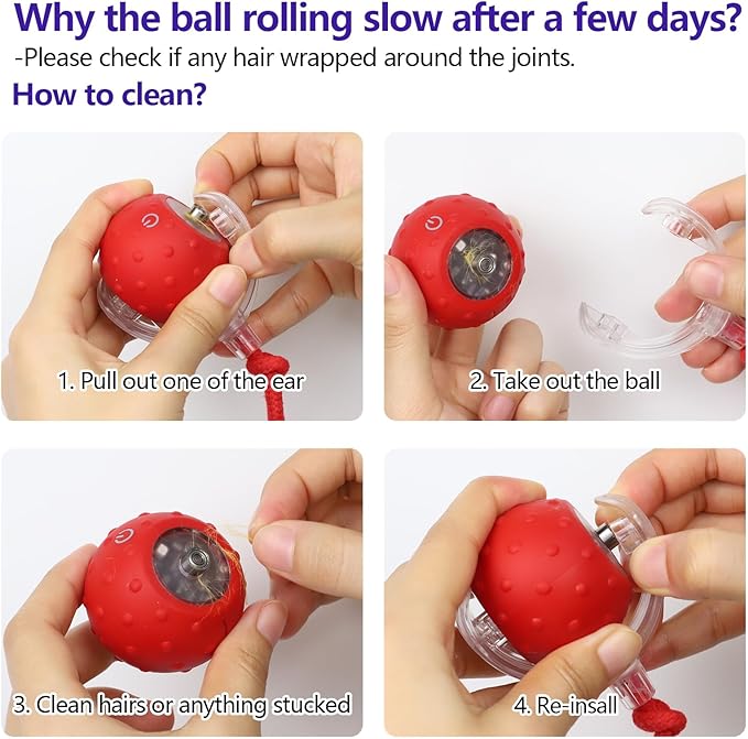 - Long press 2s to power on, choose different working mode for cats. THREE working mode - Fast speed or slow speed, interactive mode will only reaction when pet pat it. Definitely recommend for outgoing cats.(Blue lights - fast mode, purple lights - slow mode, yellow lights - interactive mode)