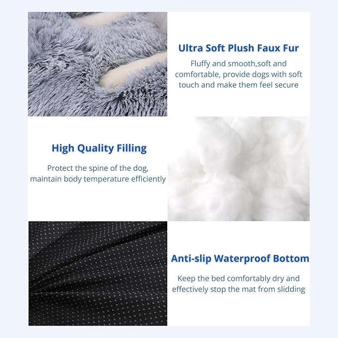 - Ultra Soft Fluffy Plush Cover: The dog bed made of luxurious fluffy faux fur fabric cover, which is very soft and comfortable. This fluffy dog bed provides dogs with soft touch and a cozy warm environment that make them feel secure. And then they can easily calm down and fall asleep.