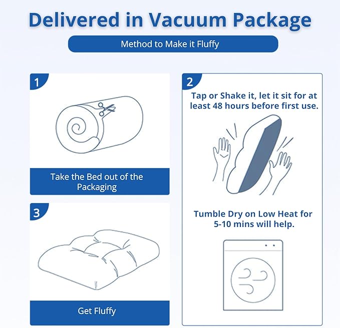- First Time Use: This plush dog bed is vacuum packing. Please remove the compression bag, shake and pat it completely, and then leave it for about 24-48 hours back to fluffy condition. Tumble dry on low heat for 5-10 mins will help.
