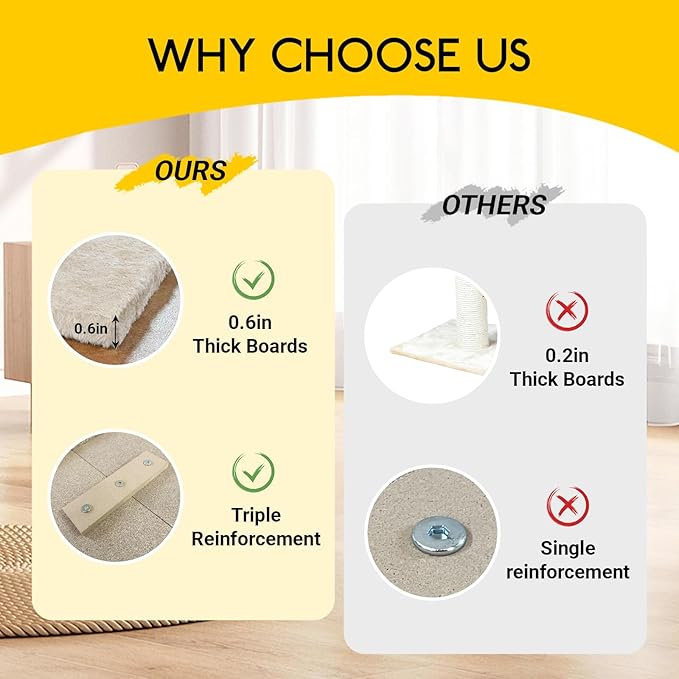 - Comfy Stable Base:Although the sisal scratching post’s structure is simple, adult cats can have full stretch and scratch away on it, without this thing turning over! The reinforced base of this scratching post is made of E1 chipboard, which can provide strong stability and hold on up to violent attack. The flannel cover make the tall scratching posts provide a place for indoor cats to lie and rest. Huge fun with the simple structure.