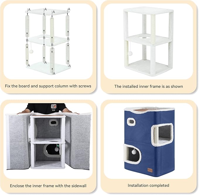 - 【Durable Scratching Post】The modern and cute cat apartment comes with a sisal cloth scratching post, which is sturdy and durable. There is 7 scratching pad on the side, and the scratching post is wrapped with natural and odorless sisal rope. The high-quality anti-scratch material allows your cat to scratch with confidence, protecting the furniture from scratches, and the scratching pad is durable and safe.