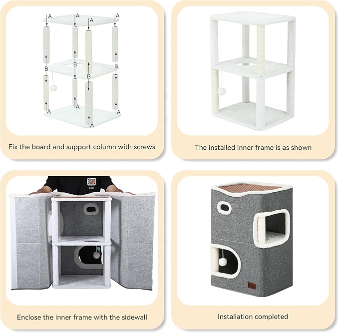 - 【Durable Scratching Post】The modern and cute cat apartment comes with a sisal cloth scratching post, which is sturdy and durable. There is 6 scratching pad on the side, and the scratching post is wrapped with natural and odorless sisal rope. The high-quality anti-scratch material allows your cat to scratch with confidence, protecting the furniture from scratches, and the scratching pad is durable and safe.