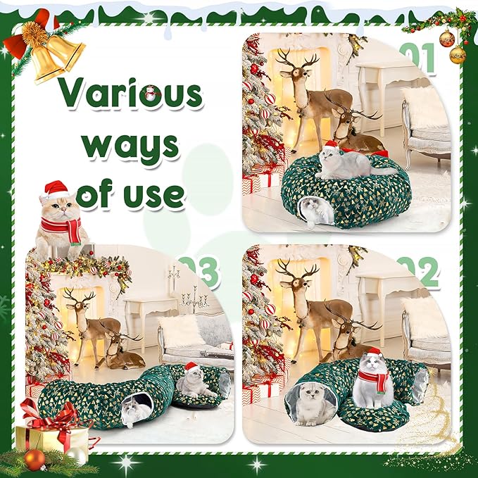 - Unique design- this Collapsible cat tubes and tunnels consists of 2 shorter cat tunnels assembled by buttons, which can also be disassembled to form a longer cat tunnel, and the entrance of the cat donut is equipped with a hanging ball for kittens to play with.