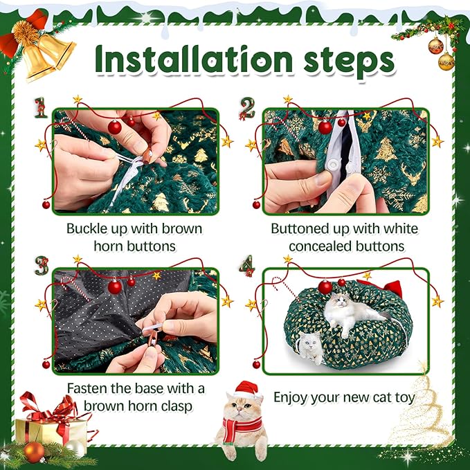 - Easy to install- the foldable cat bed tunnel is easy to install, you just need to fasten the big brown buttons in order, the small white buttons in order, and the round cushion at the bottom is also fastened with buttons.