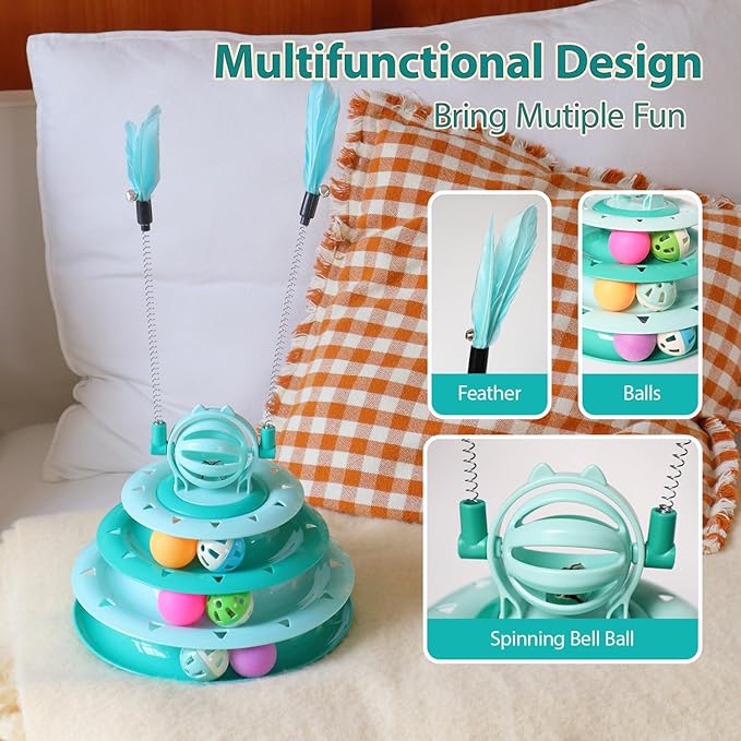 - 【Multi-functional Interaction】 Fokauiwo cat toy features a 4-tier turntable with six cat balls , a bell ball, and 2 cat teaser wands, offering diverse play options as a cat puzzle toy, cat feather toy, cat ball toy, cat chew toy
