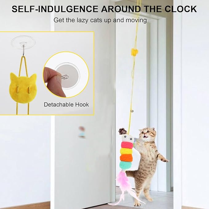- 【What you will receive】: You will receive 1 pink feather suction cup and 1 black feather suction cup, 1 pink feather teaser pole and 3 teaser replacement heads (orange, green, yellow), 1 hanging door rattling paper caterpillar, 1 hanging door pink feather caterpillar, more than enough to match your cat will love