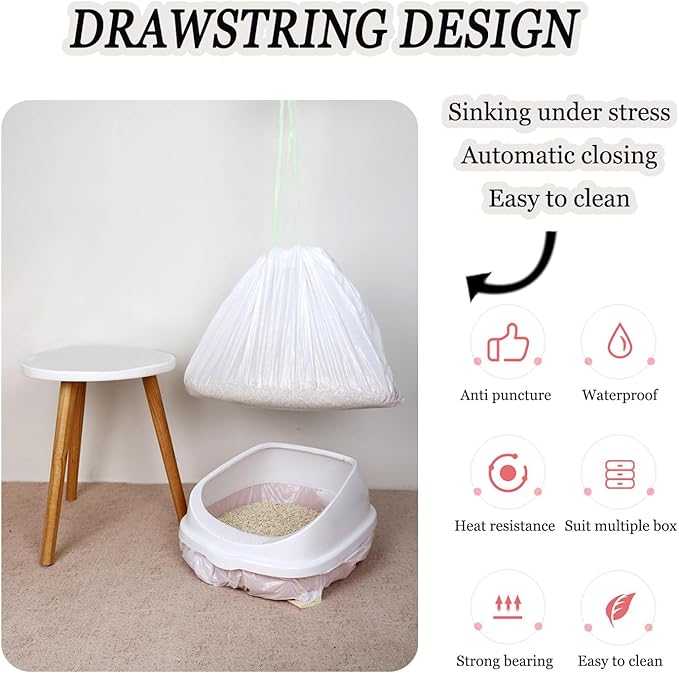 - AUTOMATIC CLOSING:The bag opening has a drawstring function. When cleaning cat litter, the drawstring of the bag will automatically retract due to gravity, making it easy to clean.