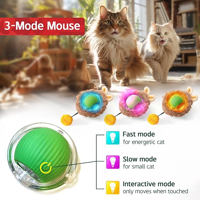 - 🔄 Three Play Modes: Choose between fast rolling, slow rolling, or interactive mode, easily distinguishable by LED lights – perfect for high-energy cats or those needing a gentle pace.