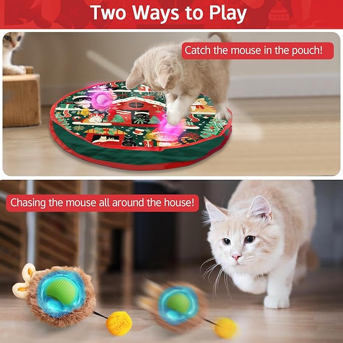 - 🎄 Festive Fun: A Christmas-themed cat toy with a fast-rolling electric ball inside a holiday-themed pouch, perfect for adding joy to your cat's playtime during the holiday season.