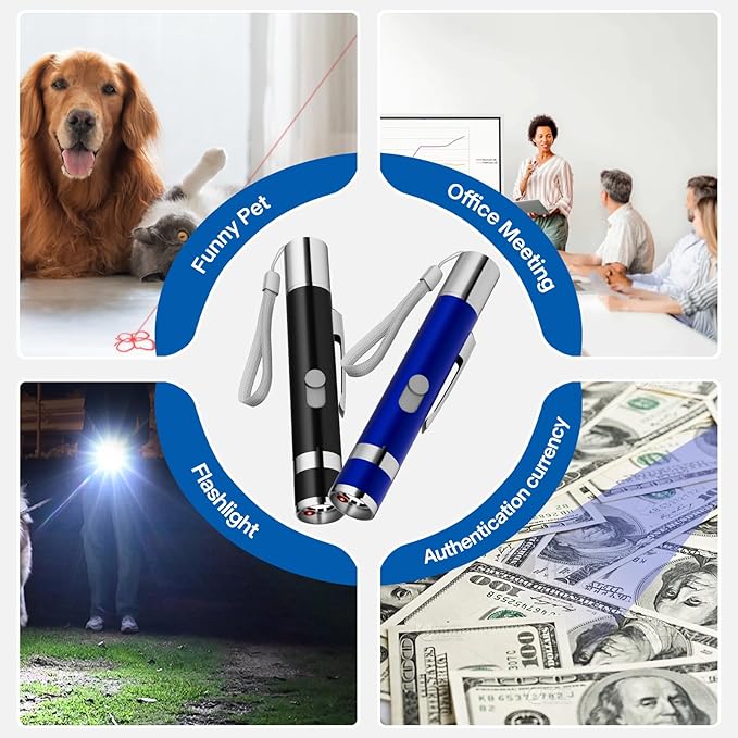 - Multi-functional: Our red dot chase light toy is not only bright and eye-catching, but also has a white mode that can glow in the dark and a purple mode that can detect money.