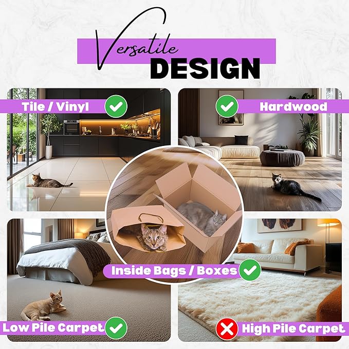 - Versatile Usage: Comes with interchangeable cat accessories—feather, butterfly, and bell attachments—that work on multiple surfaces like hardwood, tile/vinyl, and low-pile carpets, as well as inside bags and boxes