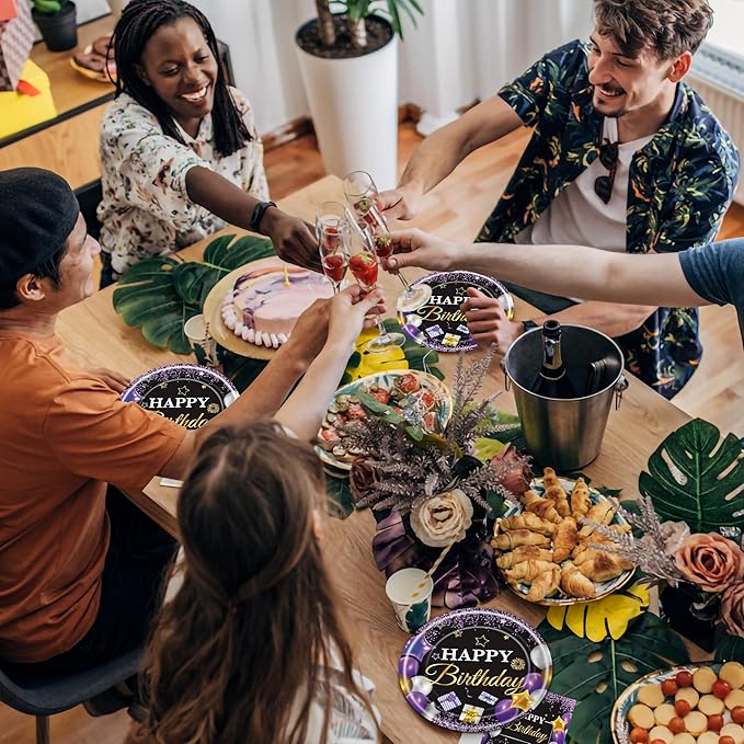 - 【Perfectly Design】This birthday theme paper plates set is designed with purple and black background, featuring stars, balloons, gift boxes, sequins and a central greeting. Vibrant patterns and bright colors are loved by children and adults, adding decorative elements to the dining table. It is perfect for your birthday celebration gathering, creating the most enjoyable activities for your friends and family, leaving behind interesting memories.