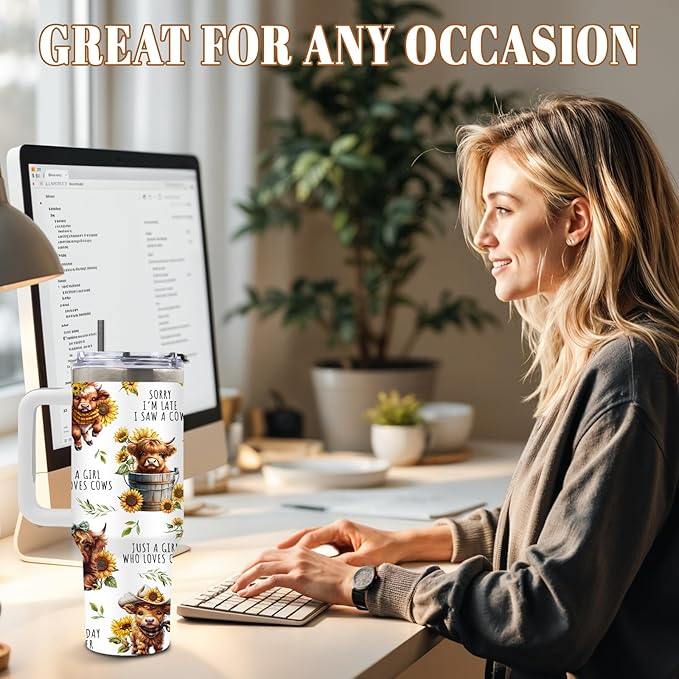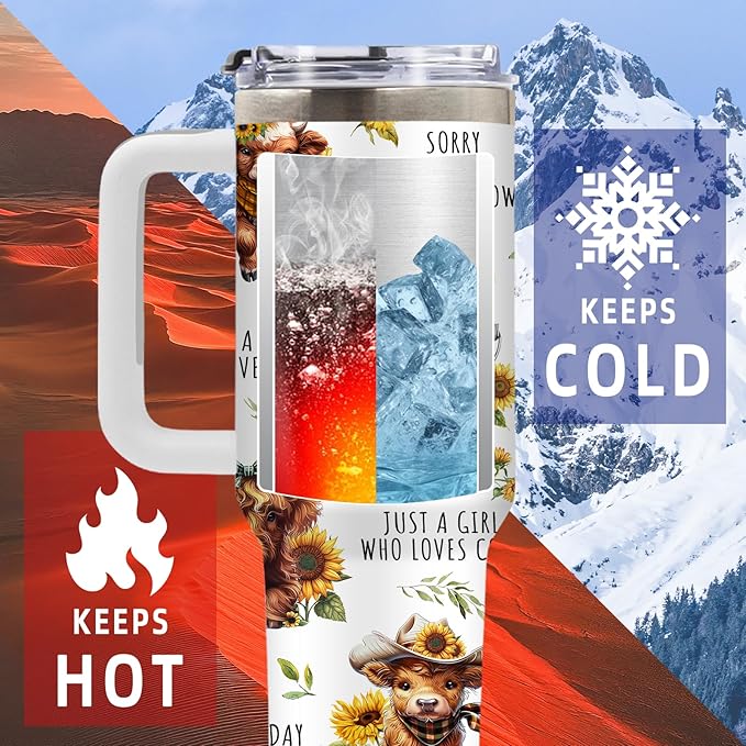 - Charming Highland Cow Design: The DUUV 40 oz tumbler features an adorable highland cow surrounded by bright sunflowers, some wearing cowboy hats and others adorned with bows, making it a nice highland cow gift. Its delightful and fun design will make any cow lover smile