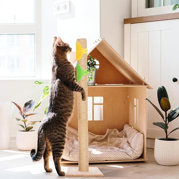 - Wall Mounted Design: Our cat self groomer features adjustable straps, allowing it to be easily attached to the legs of furniture such as tables, chairs, cat trees, and other cat-related items with legs.