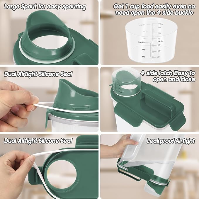 - FUNCTION: This airtight dog food container with portable handle has an airtight design,-has 2 silicone seals and 4 sealing buckles,which can keep your food dry and fresh, the portable handle and large spout design can easily Easily pours food out,also perfect for traveling, hiking, camping or picnicking with your dog。