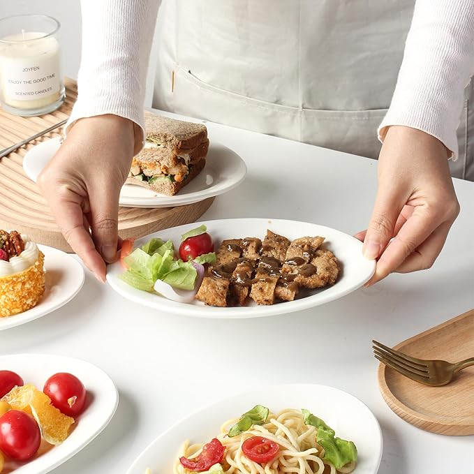 - SIMPLE AND ELEGANT - The oval design in classic pure white makes our minimalist dinnerware look stylish and bright, adding a touch of sophistication to any table setting for a timeless elegance; They can be used for dessert presentations and are ideal serving plates for dinners and parties.