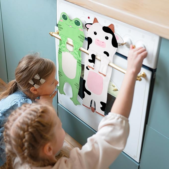- FROG DESIGN: Liven up your kitchen decor with our funny hand towel, shaped like an elongated, playful cartoon Frog. Complete with two handy clasps for easy hanging on any rod, this towel is not only visually appealing but also supremely practical