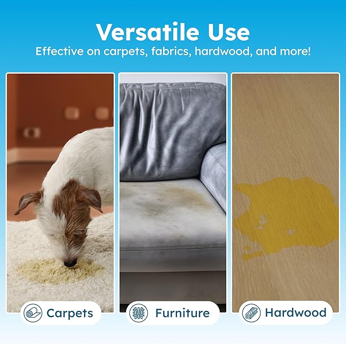 - TOUGH STAIN REMOVAL: Removes stubborn pet stains like dog urine, cat pee, litter, vomit and other organic spills with our powerful enzyme-activated formula,works on multiple surfaces, including carpets, rugs, hardwood, beddings, and upholstery without discoloration or residue.