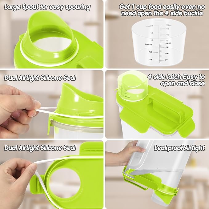 - FUNCTION: This airtight dog food container with portable handle has an airtight design,has 2 silicone seals and 4 sealing buckles,which can keep your food dry and fresh, the portable handle and large spout design can easily Easily pours food out,also perfect for traveling, hiking, camping or picnicking with your dog