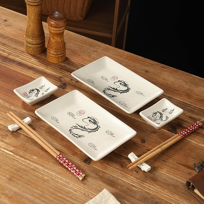 8 pcs Japanese Sushi Plate Sets Serving Platters and Trays for Entertaining Sushi Dishes Set Plates Sushi Plates Traditional Cuisine Dinnerware Sets with Chopsticks Dragon