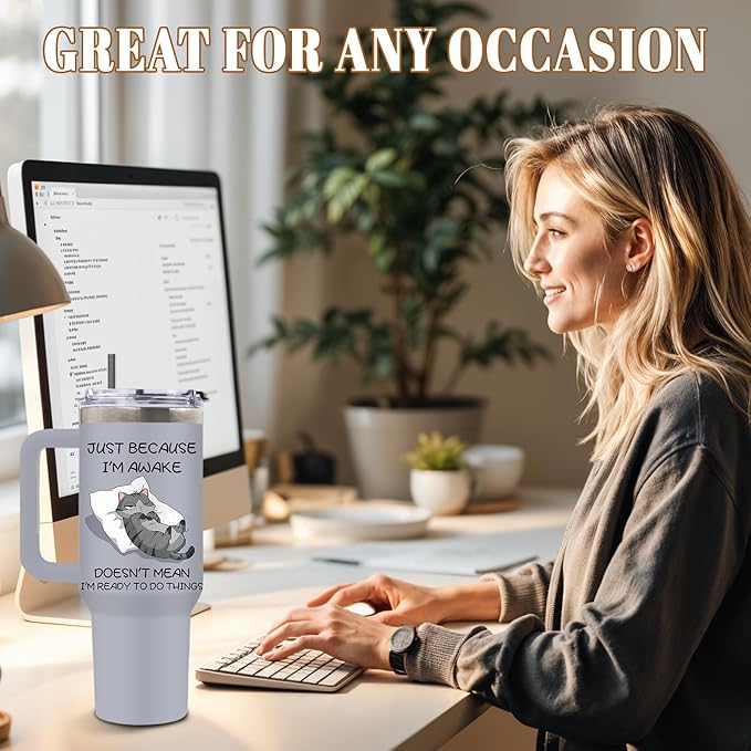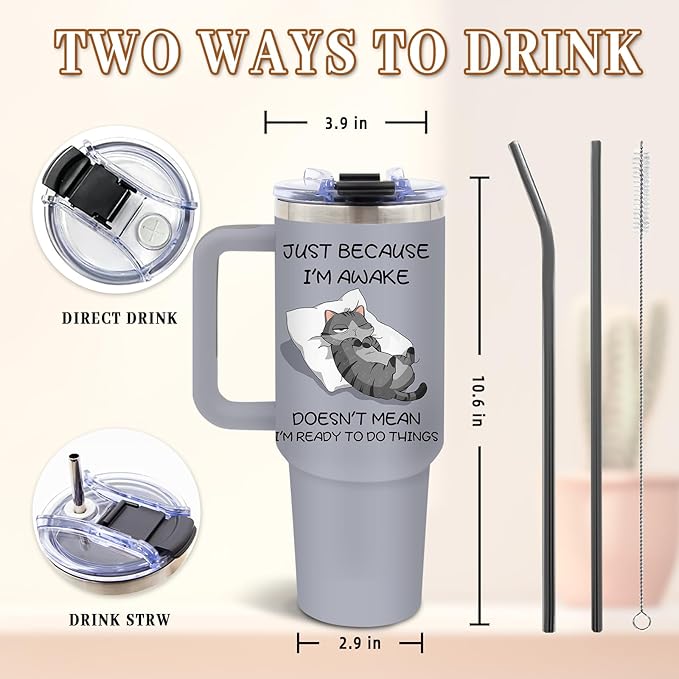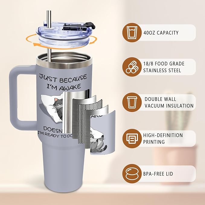 - Funny and Relatable Design: This 40 Oz tumbler features a playful lazy cat lounging on a pillow with the quote "Just because I'm awake doesn't mean I'm ready to do things," suitable for those who cherish slow mornings and a relaxed start to the day