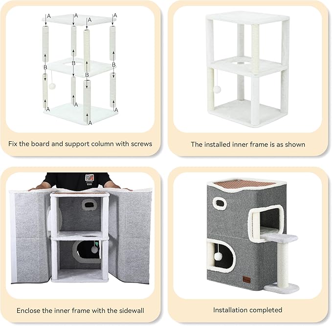 - 【Durable Scratching Post】The modern and cute cat apartment comes with a sisal cloth scratching post, which is sturdy and durable. There is 3 scratching pad on the side, and the scratching post is wrapped with natural and odorless sisal rope. The high-quality anti-scratch material allows your cat to scratch with confidence, protecting the furniture from scratches, and the scratching pad is durable and safe.