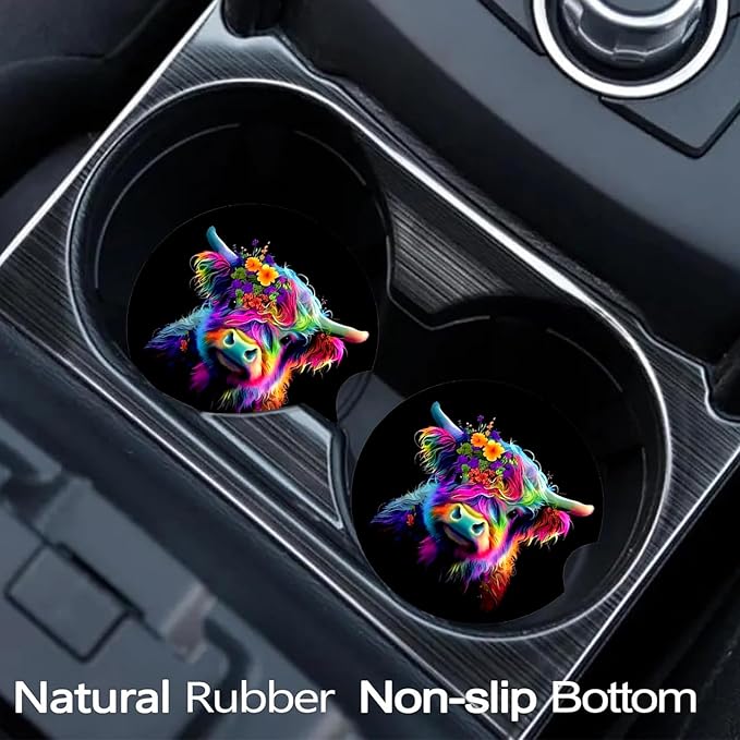 - ✅ Adorable Highland Cow Design: Upgrade your car interior with our Highland Cow Design Neoprene Car Cup Holder Coasters! Featuring cute Highland Cow patterns, these coasters add a touch of personality to your car interior, perfect for Cow lovers and pet enthusiasts,that add a playful touch to your vehicle.