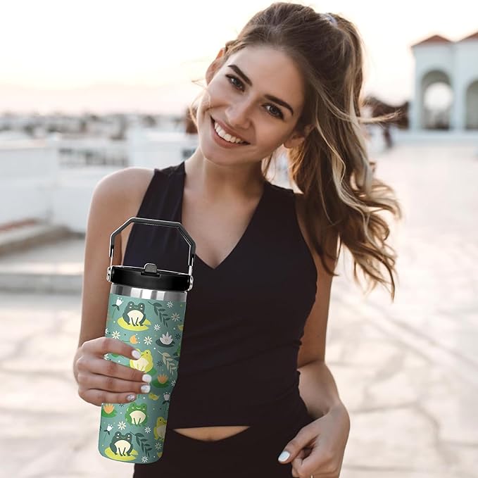 - Metal Tumbler Sturdy And Durable: this 30 ounce tumbler is made of high-quality stainless steel, it has excellent resistance to drop, pressure and corrosion. The straw and lid of the frog water bottle are made of safe, high-quality plastic and silicone. 30 ounce tumbler with handle and straw can accompany you through a long time.