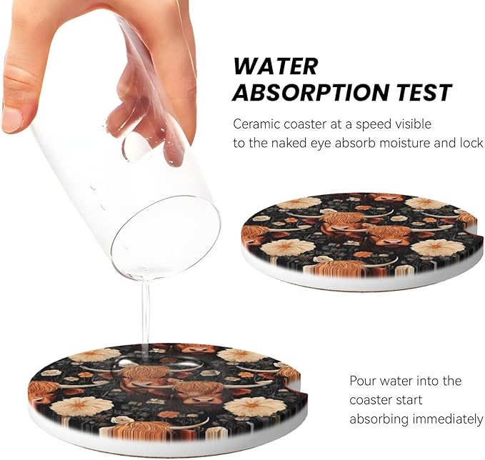 Absorbent Ceramic Car Coasters for Cup Holders, Yak Highland Cow Flower Design 2.56" Anti Slip Universal Drink Cup Coasters for Women Men (2 Pack)