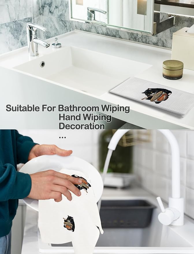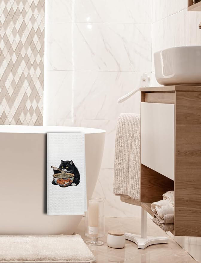 Black Cat Kitchen Hand Towels Bathroom Decor, Funny Japanese Noodle Cat Dish Towels Tea Towels for Kitchen,16x24 Inch