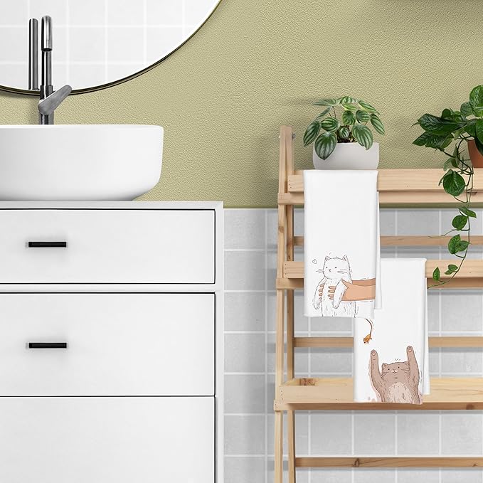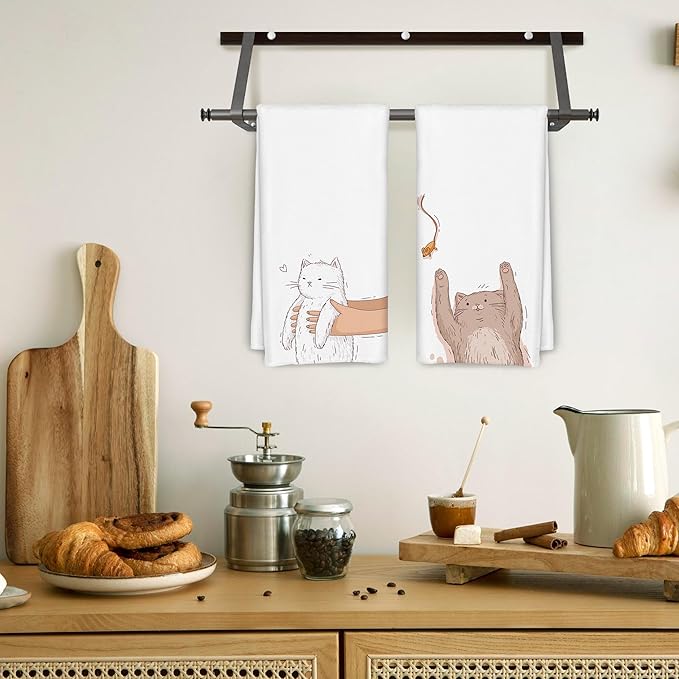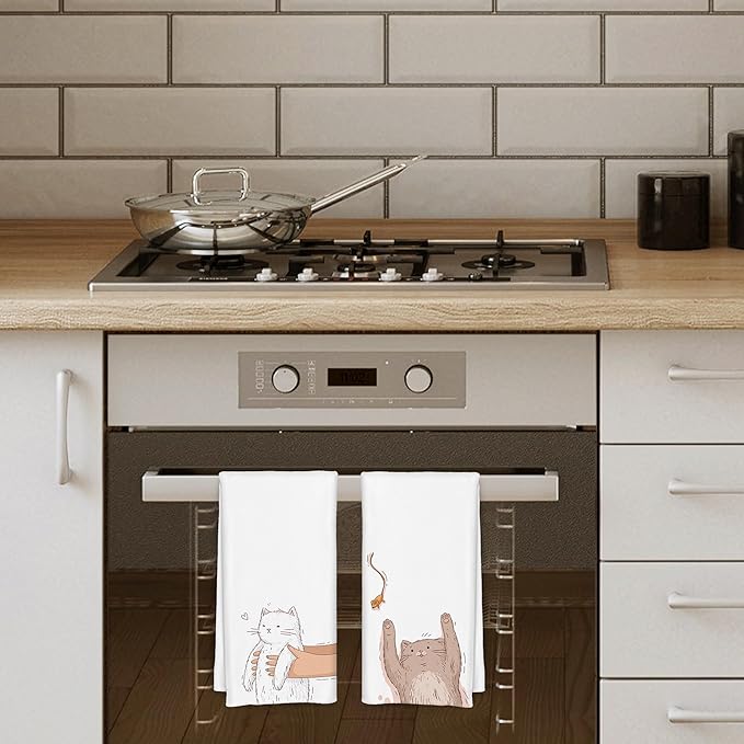 Cartoon White and Grey Cat Kitchen Towels Set of 2, Funny Cat Lover Mom Lady Gifts Dish Towels for Kitchen Decor, Cute Kitten Hand Towels for Bathroom Decor, 16x24 Inch