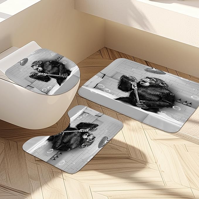 4Pcs Funny Monkey Shower Curtain Set with Non-Slip Rugs, Toilet Lid Cover and Bath Mat, Black White Animal Chimpanzee Singing in Bathtub Men Bathroom Set with 12 Hooks, Modern Cool Bath Decor