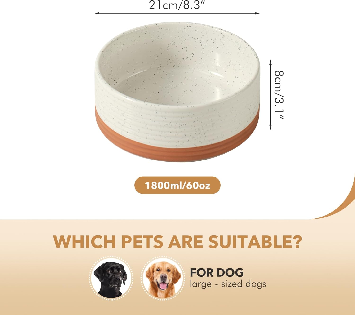 - Capacity: Each single dog bowl measures about 8.2" Dia and 3.1" H. It's wide enough to be filled with 7.6 cups food or 60 oz water. These wide pet bowls are suitable for Large breed dogs.