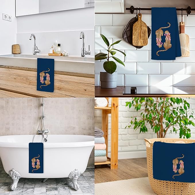 Coquette Pink Bow Two Cheetah Kitchen Towels, Navy Blue Leopard Hand Towels for Bathroom Kitchen, Trendy Preppy Leopard Decorative Dish Towels Drying Cloth, 16x24 Inch
