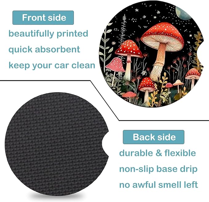 - ✅Starry Night Mushroom Design: Upgrade your ride with our Starry Night Mushroom Themed Car Coasters! Perfect for Starry Night Mushroom lovers gifts, these durable,non-slip coasters add a some natural touch to your vehicle. Easy to clean, they’re a must-have for road trips and daily commutes. Embrace the legend today!