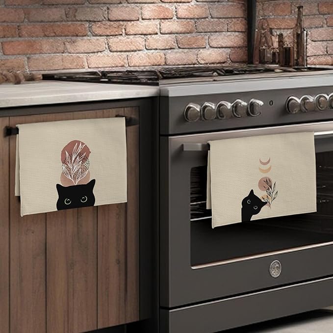 Abstract Boho Botanical Black Cat Kitchen Towels Set of 3, Cat Lover Mom Lady Gifts Decorative Dish Tea Towels, Boho Neutral Mid Century Modern Hand Towels for Bathroom Decor, 16X24In