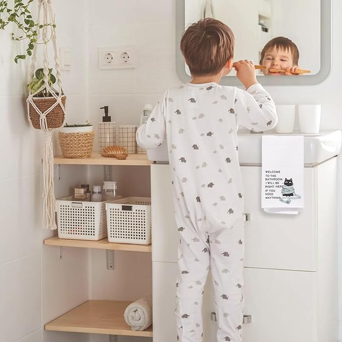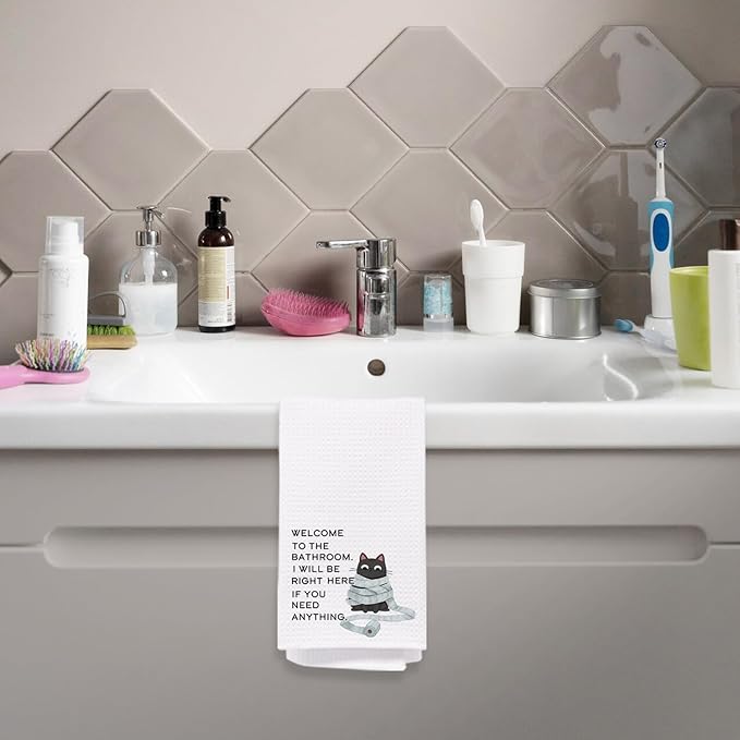 Black Cat Bathroom Hand Towels, Welcome to The Bathroom Humorous Black Cat Decorative Hand Towels, 16x24 Inch